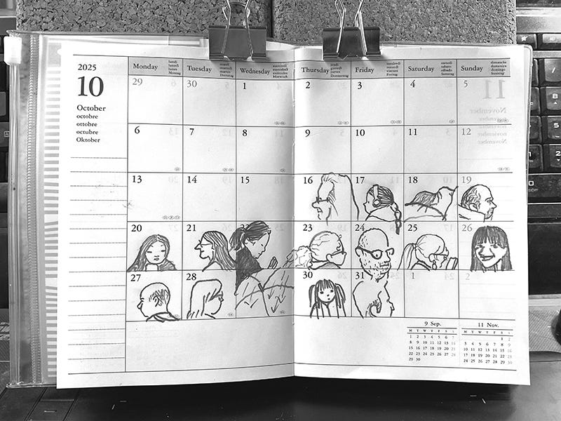 Apart from singing, I’m also drawing more. I have set a tiny task for myself. I bought an agenda that has one of those monthly organizers. I decided to draw someone I saw on the street every day. The agenda has a front pocket, where I keep a pencil, a pencil sharpener, and an eraser. It fits a pocket, and I quickly doodle a face that interests me.