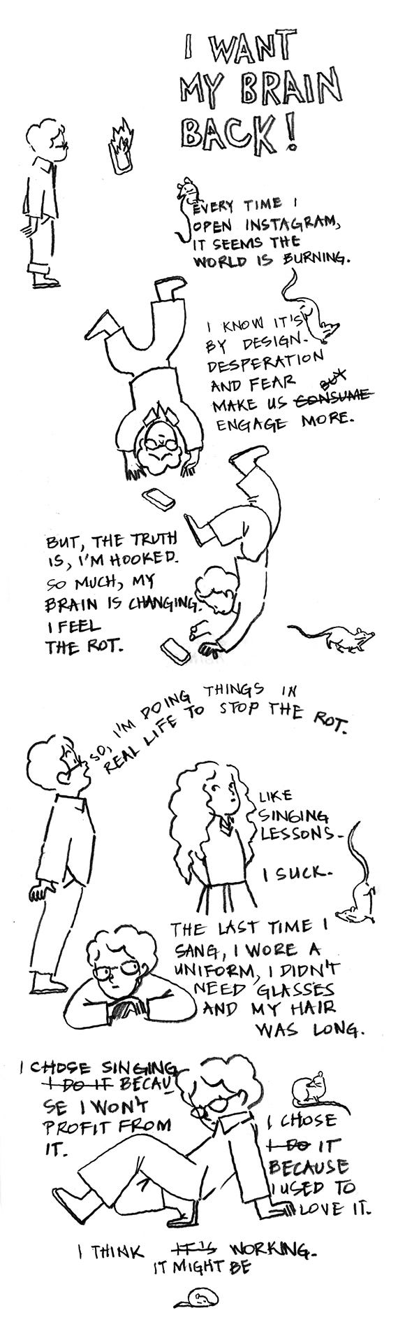 Before I deleted Instagram, I had noticed my feeling of despair grew when I opened it. It was the only social media app left on my phone, I got rid of the rest because of all the noise, but I was still anxious. I realized that every two posts on my feed there were videos of catastrophic events. They seemed to be happening, but when I checked the newspapers, they were from previous years. As if what is actually going on wasn’t enough. I still worry about the world, but I’ve decided not to turn on my full apocalypse mode all the time. Because if I think everything is ending, I won’t fight for what’s worth preserving.